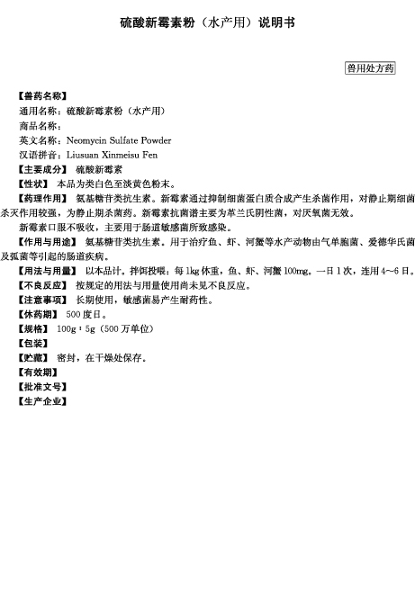 用于治疗鱼、虾、河蟹等水产动物由气单胞菌、爱德华氏菌及弧菌等引起的肠道疾病。